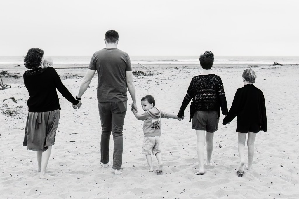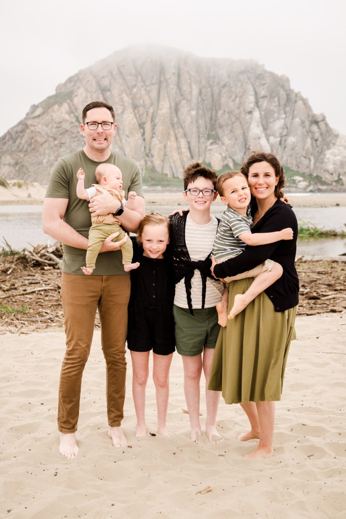 Pictured is my husband, our bio daughter and son, and my two bonus daughters. Missing are our two kitties, Aglio and Olio.